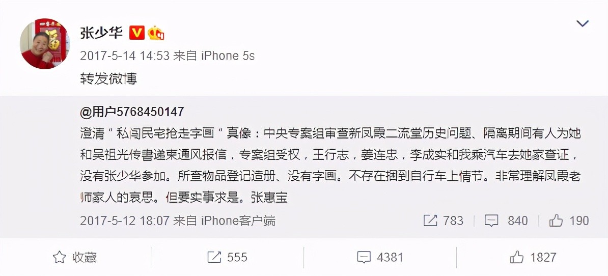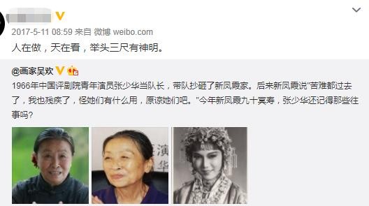 2017年,在新凤霞90冥寿之际,其子吴欢发了这样一条微博,一下把张少华推上了风口浪尖。