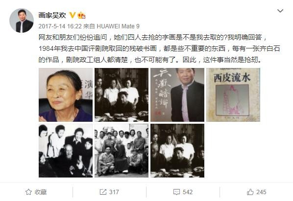 随后,吴欢还指责张少华抢了他们家收藏的齐白石字画(新凤霞是齐白石义女)。
