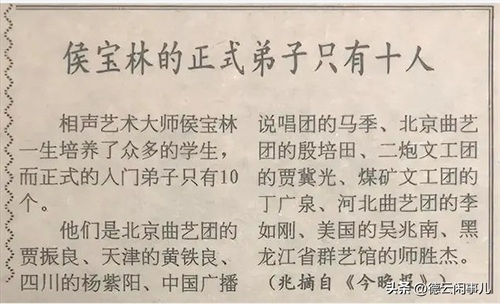 而当时报纸上也刊登过,侯宝林的正式弟子只有十人,还公布了这十名弟子的信息,贾振良、黄铁良、杨紫阳、马季、殷培田、贾冀光、丁广泉、李如刚、吴兆南、师胜杰,这份名单里面也没有郝爱民、于世猷、韩宁。