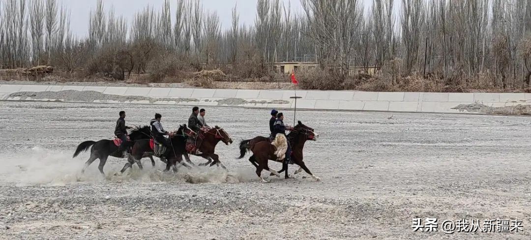 当地农民们骑上马背,分成两对进行叼羊比赛,哪队的人先带着羊拔出旗子,哪队就获胜。