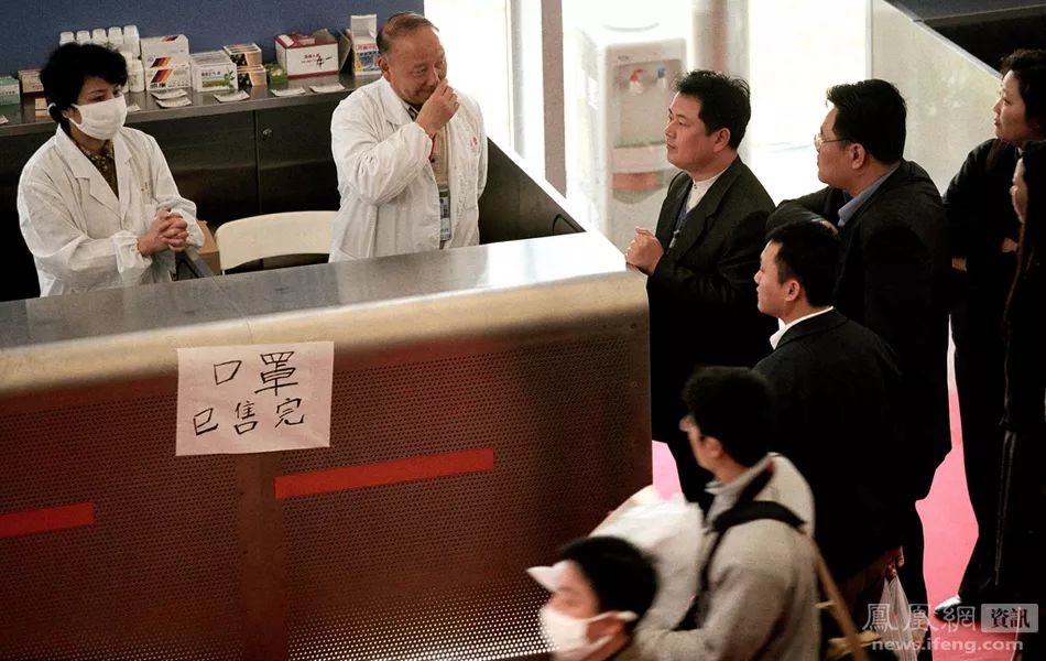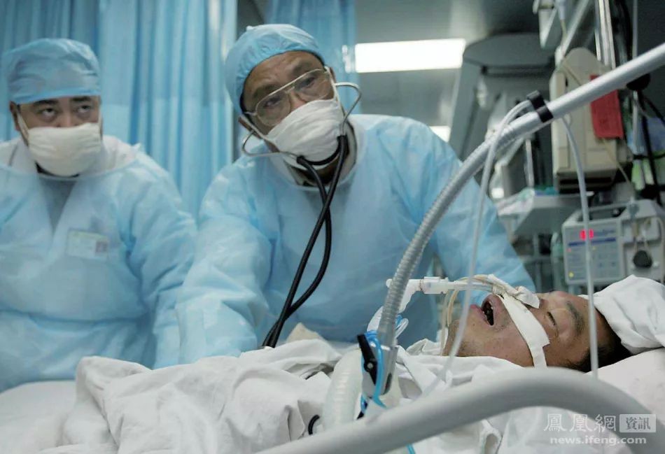 (2003年2月16日,钟南山(右)与其他专家一起医治一名非典病人。来源:凤凰网资讯)