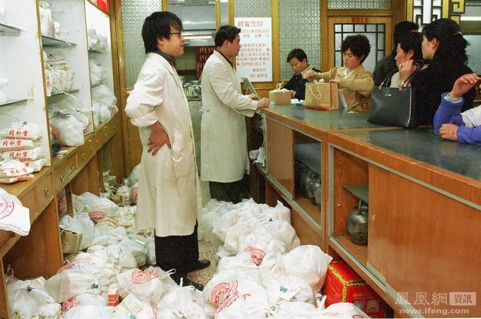 (2003年4月9日,北京一家同仁堂药店,人们购买据说可以预防非典的中药。来源:凤凰网资讯)