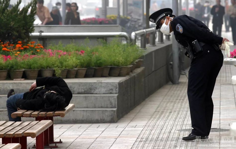 (2003年4月25日,北京,一名戴着口罩的警察询问一名被群众举报为疑似非典患者的妇女。Str/摄)