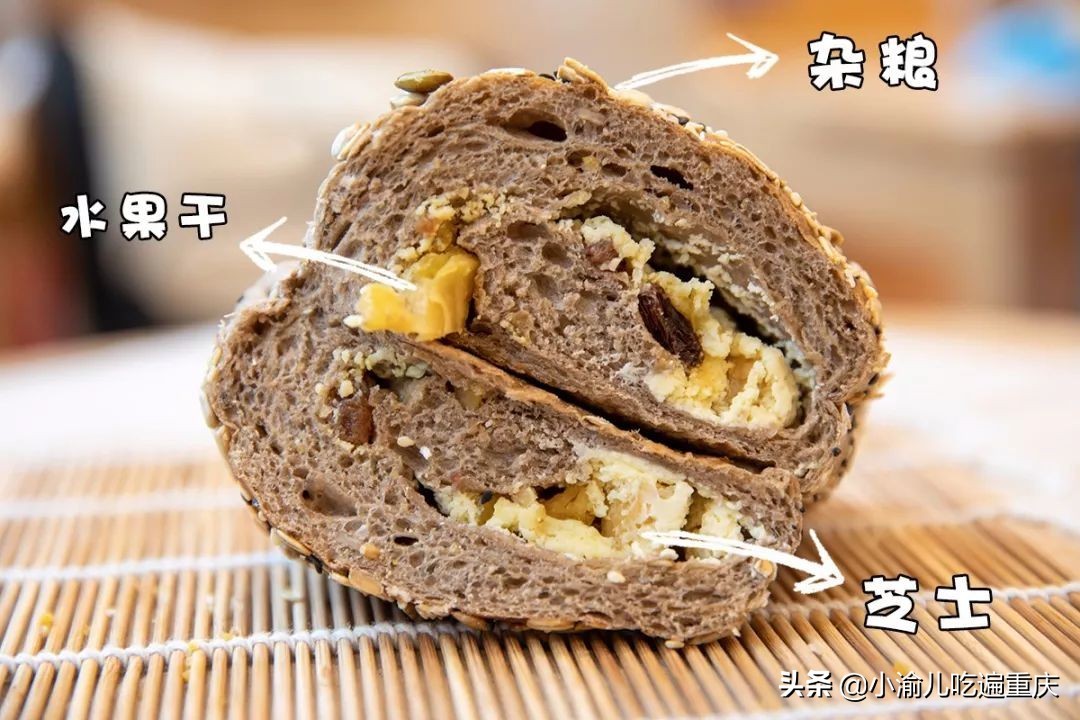 粗粮包裹之下,是软甜的芝士和香甜的菠萝、葡萄等果干。
