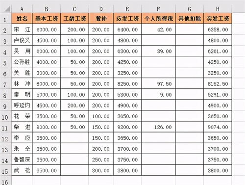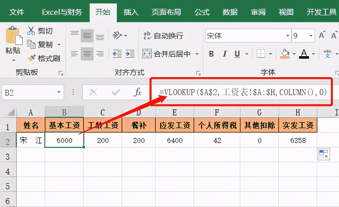 =VLOOKUP($A$2,工资表!$A:$H,COLUMN(),0)