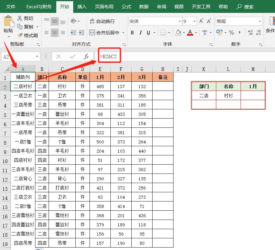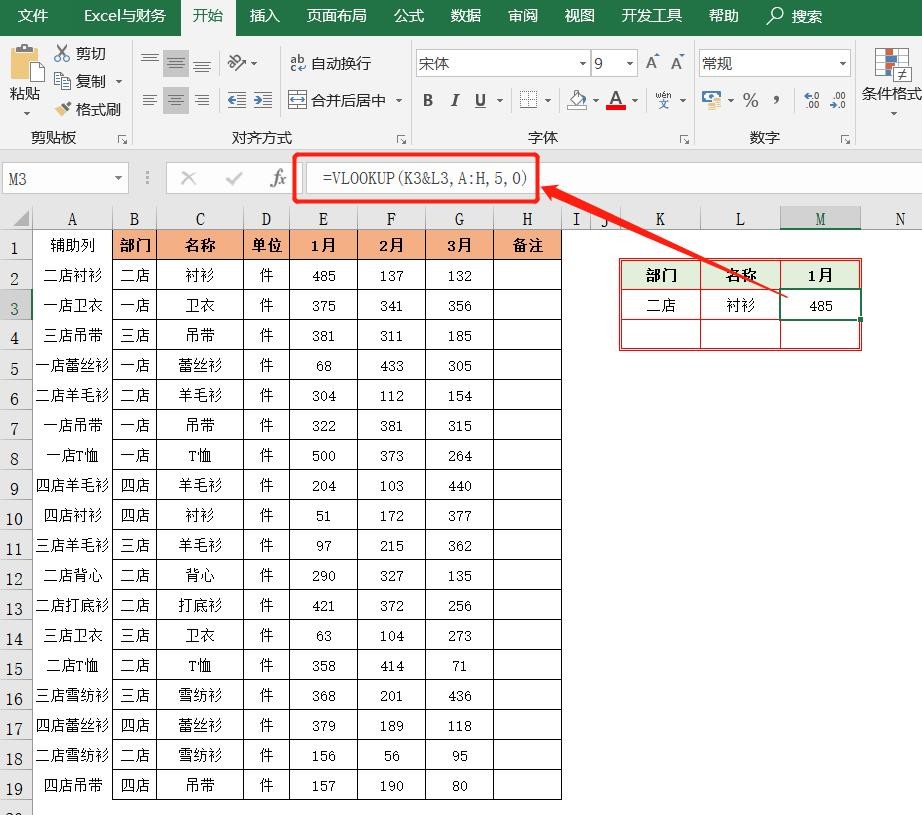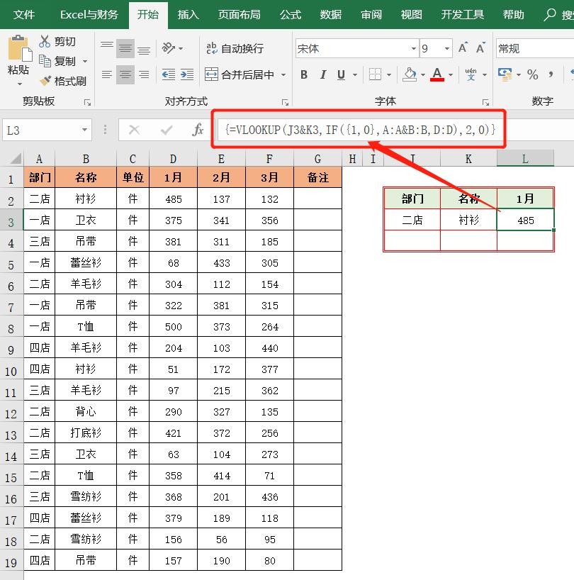 功能:要求根据“名称”,把“1月”、“2月”、“3月”对应的销售数据匹配出来。