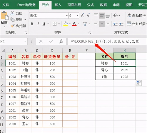 在H2单元格输入公式:=VLOOKUP(G2,IF({1,0},B:B,A:A),2,0) ,再下拉复制公式。