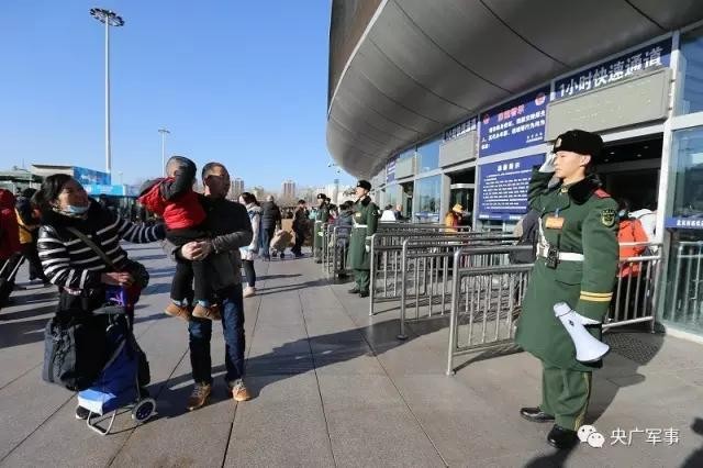 武孟杰在春运期间的北京西站向父母敬礼。