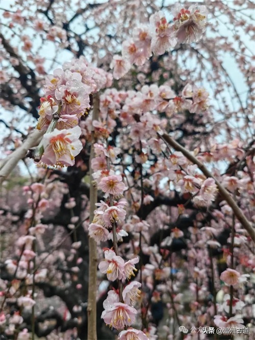 只见一株株排列整齐的龙梅枝条如雨伞状,向四周撑开垂悬,花朵缀满枝头,远望如粉色瀑布飞泻,近观似星河倾落。此刻的龙梅,既有“柔能克刚”的坚毅,又带着“零落成泥碾作尘,只有香如故”的清寒,恰似一位身着素衣的仙子,伴着薄雾翩翩起舞。望着这龙梅,我的心仿佛也被那缕缕清香浸润,变得无比宁静。