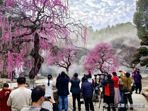 相传这批龙梅为寺院住持释明心法师于 2013 年亲手栽种,十数载过去,虬枝已具游龙之态。龙梅于春日里舒展娇姿,为天地增添一抹诗意,也给人们的心灵留下一隅宁静。此刻不禁令人想起宋代诗人张道洽的诗句:“行尽荒林一径苔,竹梢深处数枝开。”这龙梅虽生于禅寺,却如同隐于深林的雅士,不与世俗争艳,自有其超凡脱俗的气质,吸引着众多游客前来赏梅。此刻,人们手持手机对准龙梅,扛着长枪短炮瞄准龙梅,还有无人机在空中盘旋,这里俨然成了摄影爱好者的梵天净土。