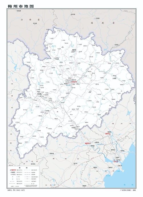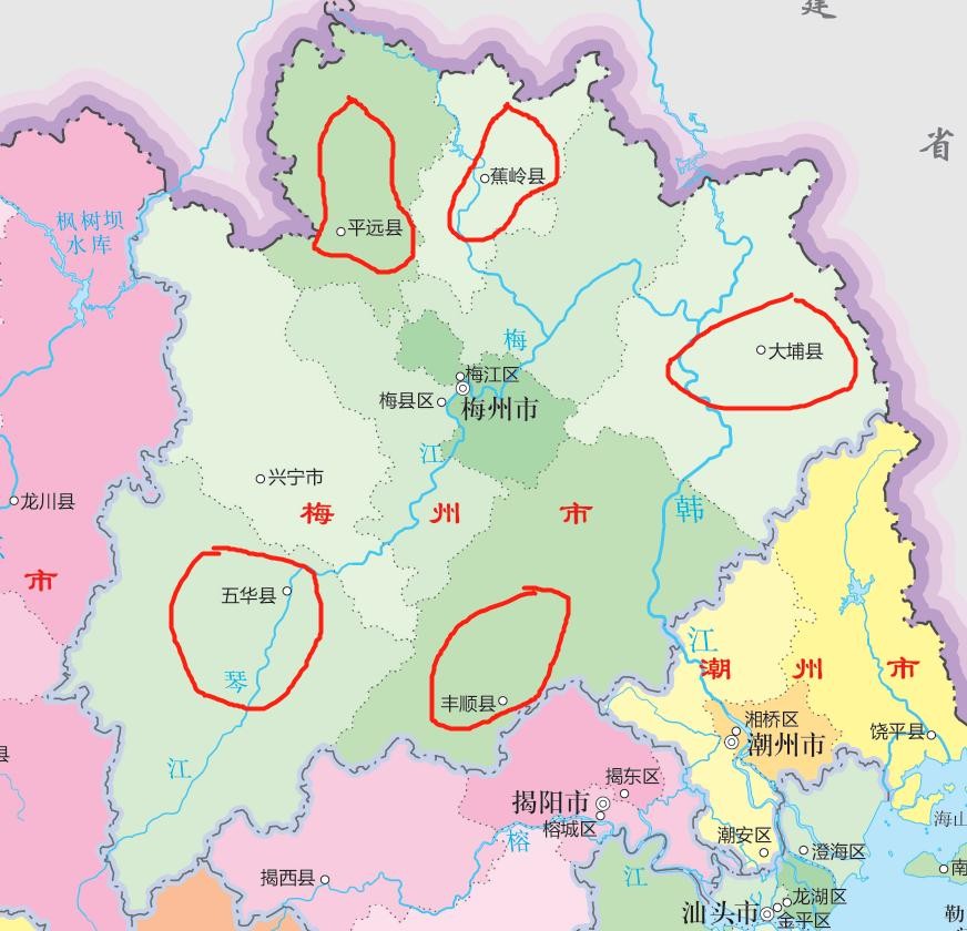 梅州市辖2区、5县、1市,大埔、丰顺、五华、平远、蕉岭5县的位置如上图所示。