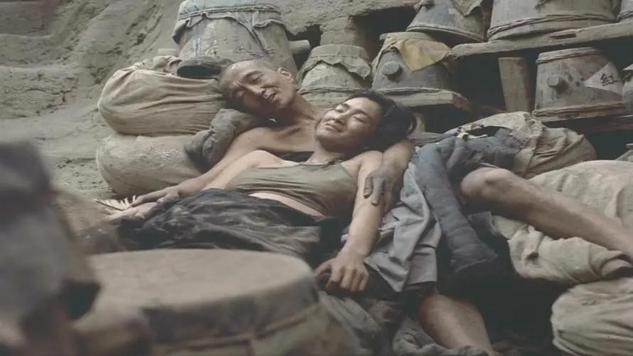 菊豆和天青仰面躺在地上沉重的棺材从他俩身上抬过压抑得他们喘不过气来再加上四周的密密麻麻的抬棺材的人的腿将他们牢牢地围困其中。