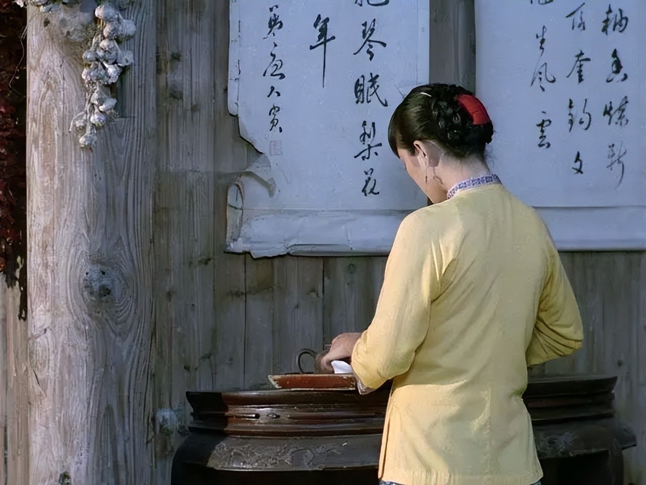 在片头部分,导演用一个俯拍的全景镜头表现杨家染坊的全景,这不仅仅是交代了人物的生活环境,而且还为全片定下了感情基调。