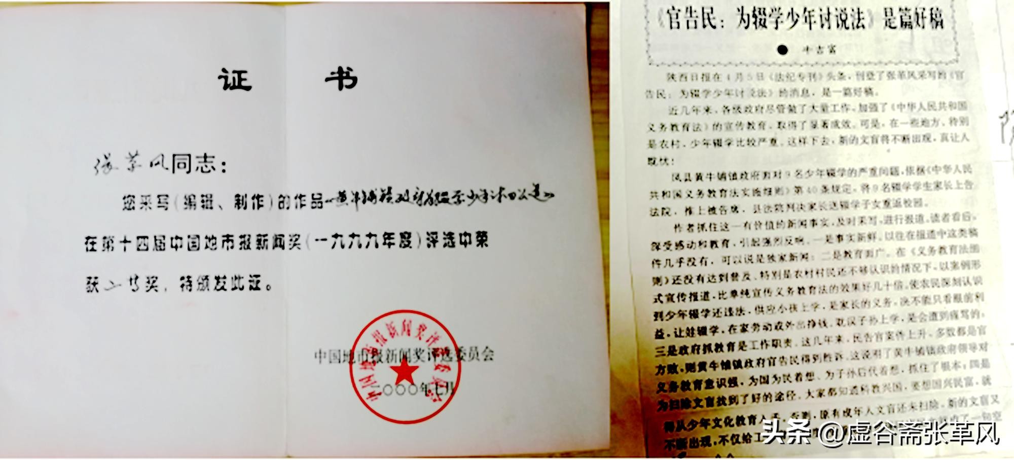 上左图为中国地市报年度好新闻二等奖奖证;右为陕西曰报通讯刊登的报评文章。