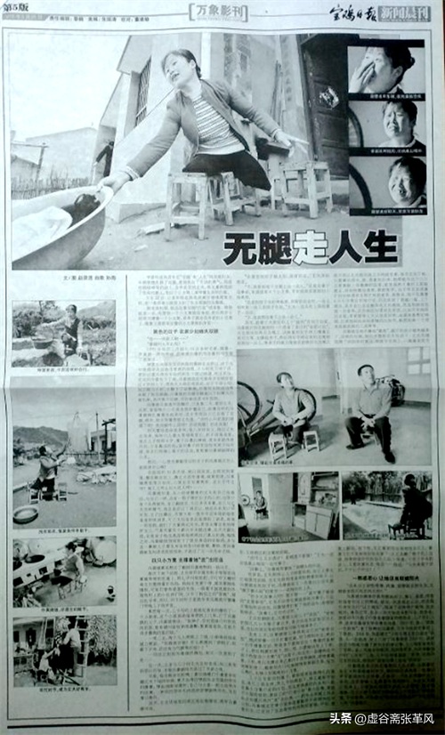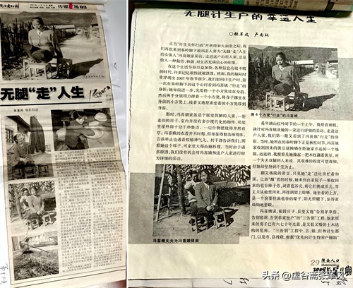又比如2007年春节,我们随县领导分头采访首次向计生贫特困户发放我县发起的救助公益金,采访中我发现,黄牛铺镇周家庄的冯喜娥虽然高位截瘫,仍自强不息面对生活,我便重点对其进行了采访,并以图片新闻、消息、通讯、特写等多种形式,对其进行了报道,先后被新华网、中国人口报、陕西日报、陕西农民报、陕西人口杂志、宝鸡日报和省市电台等多家媒体采用,还使冯喜娥跻身我县感动2007年十大人物,受到表彰。我的摄影作品《无腿走人生》还入选陕西省第14届艺术摄影展。