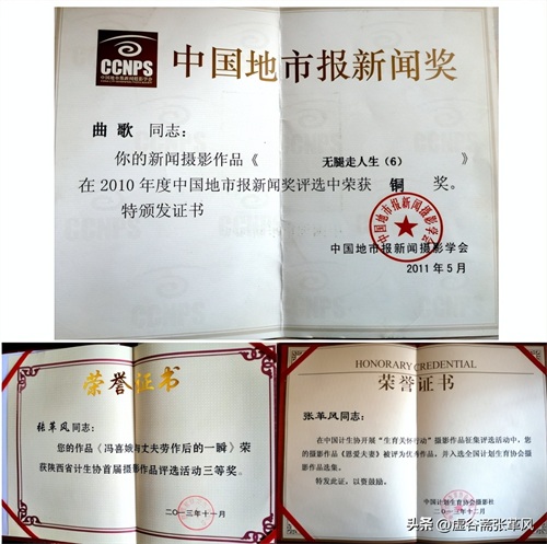 2010年,宝鸡曰报副总编辑赵录贤、记者孙海又邀我再次深入冯喜娥家进行了联合采访,并在宝鸡曰报万象影刊以《无腿走人生》整版图文推出,这篇报道在第25届中国地市报新闻奖评选中,获得一等奖,同时获摄影铜奖。2014年我的摄影作品《恩爱夫妻》入围中国计生协会举办的《生育关怀行动》摄影作品征集,《冯喜娥与丈夫劳作后的一瞬》获得陕西省计生协举办的首届书法、摄影、剪纸作品评选活动三等奖……