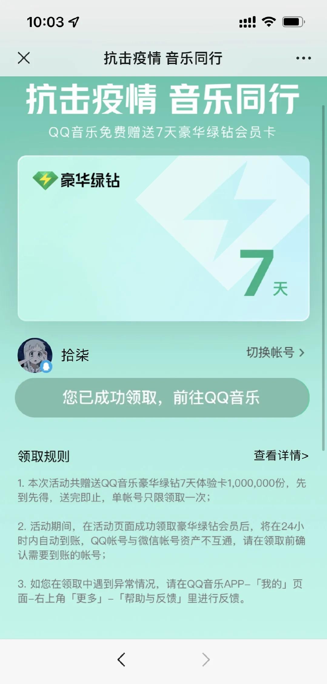 Tech星球3月15日消息,今日,腾讯QQ音乐宣布,抗击疫情,音乐同行,向所有人免费赠送豪华绿钻会员卡7天,无地区限制,所有人都可领取,限量100万份,单帐号只限领取一次。除QQ音乐外,全民K歌也宣布赠送100万份7天VIP会员体验卡,送完即止,单帐号只限领取一次。