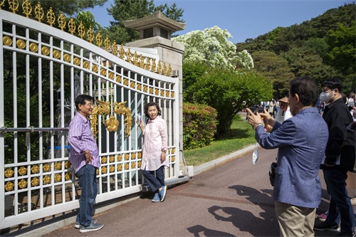 5月12日,在韩国首尔,游客参观青瓦台时合影留念。 新华社记者 王益亮 摄