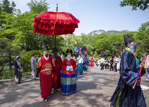 5月12日,在韩国首尔,游客观看青瓦台内的文化巡演。 新华社记者 王益亮 摄