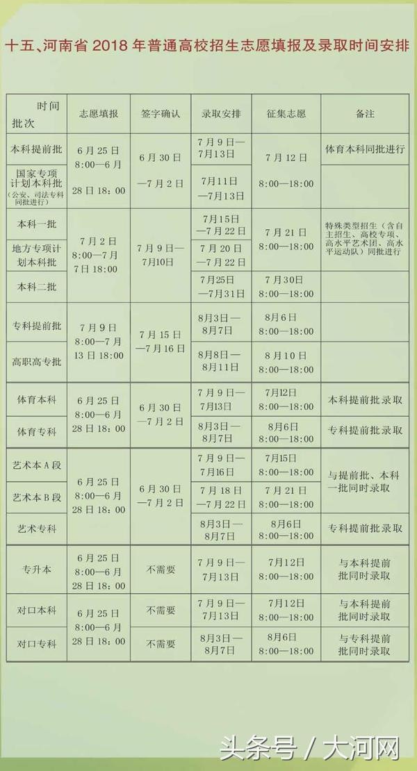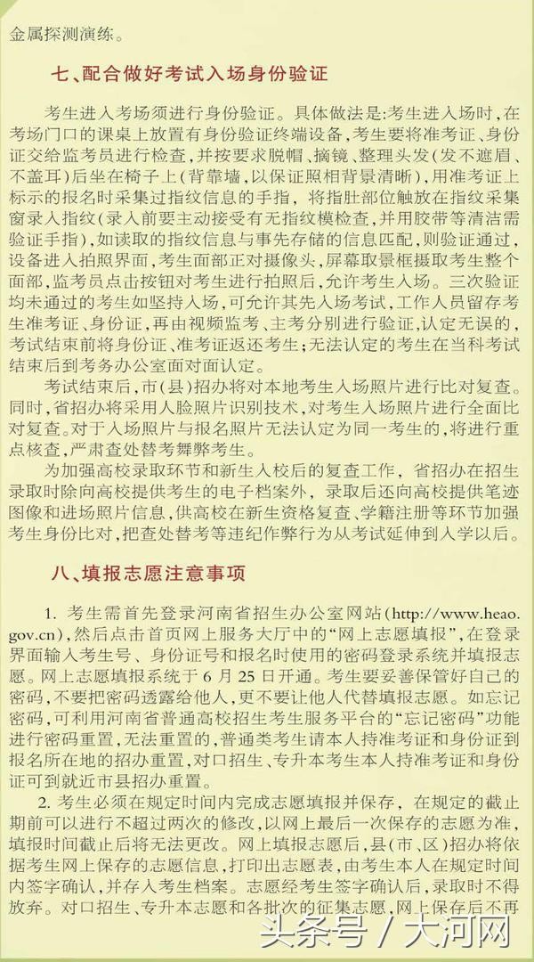 大河网讯(记者 张楠)6月6日下午,考生察看考点、考场;6月25日零时查询高考成绩;本科一批、本科二批、高职高专批均实行平行志愿……5月31日,河南省2018年普通高校招生《考生指南》公布,详解今年高考、高招录取过程中考生和家长关心的问题。