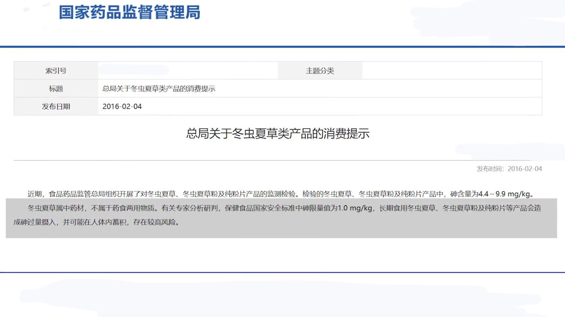 在2016年我国食品药品监管总局提示,冬虫夏草中的砷超出正常安全标准4~9倍,如果长期食用相关产品,会造成砷过量摄入,在人体中蓄积,存在较高风险,其实虫草中确实有一个种类含有抗生素,在1951年德国科学家就发现了一种被蛹虫草寄生的昆虫,它们会分离出腺苷类活性物质,也被命名为虫草素,而这种物质就是核苷类抗生素,被媒体吹捧的一种活性成分