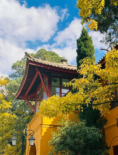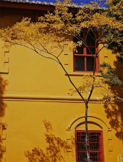 建筑通体都以黄色为主,坡屋顶保留了中国传统建筑风格,门窗都是以中国红为代表,门头则加入了西方建筑手法,彰显了在近代的中西结合的教学理念。