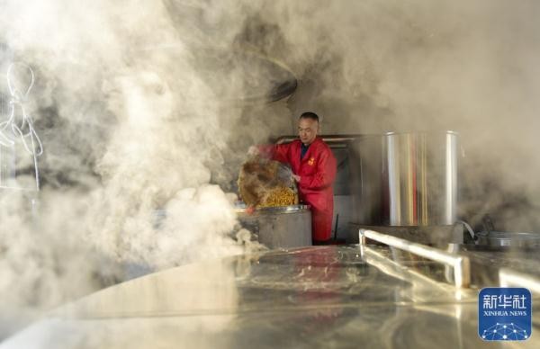 ↑1月11日,宣恩县椒园镇水田坝村的酿酒师王生远从甑中舀出蒸熟的玉米,准备进行发酵处理。新华社发(宋文摄)