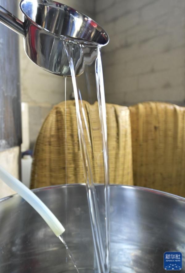 ↑宣恩县椒园镇水田坝村一酿酒作坊酿出的包谷酒清澈透亮(1月11日摄)。新华社发(宋文摄)
