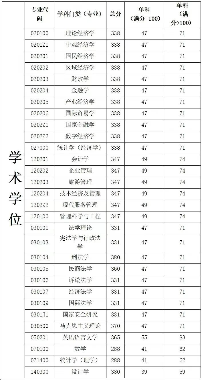 可以查看下列的图片,2024年的研考国家线法学和经济学的分数线,分别是331分和338分。