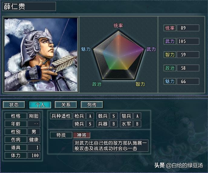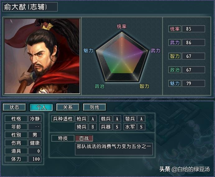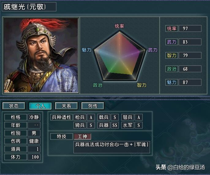 比较巧合的是,明朝势力另一位高统武将徐达的特技为驱逐,这也使得徐达自身对战法和气力的需求并不是特别大,所以明朝麾下的百战武将俞大猷自然是被戚继光纳入了后宫之中。