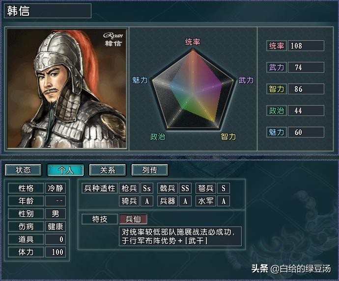 而关羽和韩信的组合从各方面来看都是非常的搭配:韩信自身的兵仙特技保证了战法的成功率,关羽的特技神将和高武力值提升了部队的伤害,同时关羽的武器昂扬刀为部队的续航提供了充足的保障,主要拥有攻心剑和抵抗计略的副将,那么这只部队将能成为真正的“永动机”。