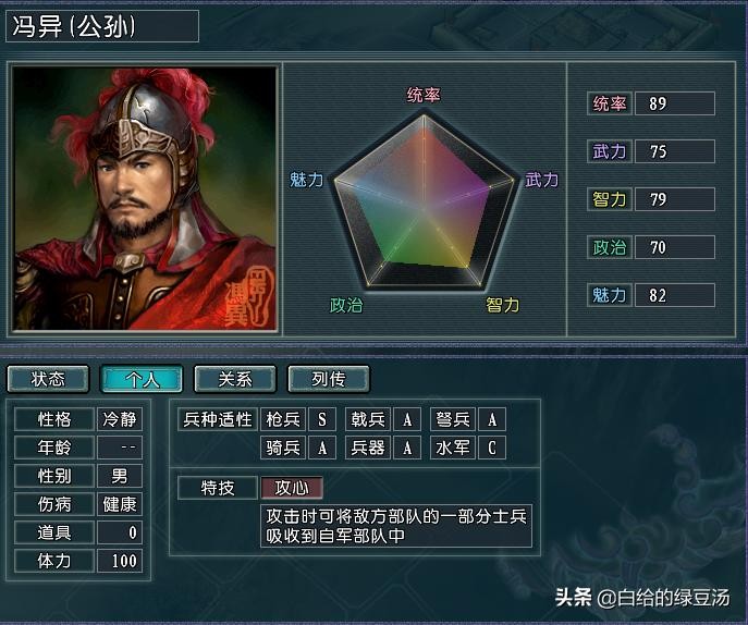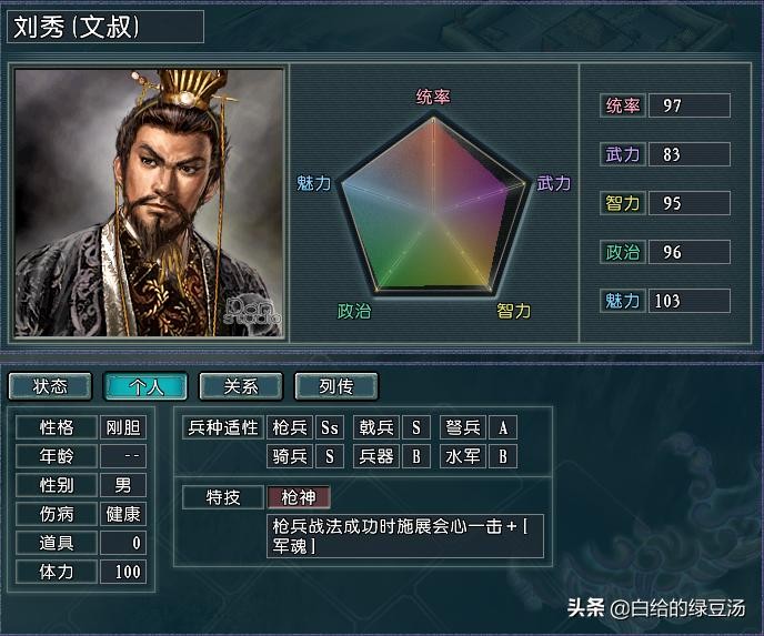 由于东汉势力上层战力的严重缺失,导致了东汉在开局的时候,不论什么兵种,在配备合适的副将的情况下,君主刘秀都是毫无疑问地最强。