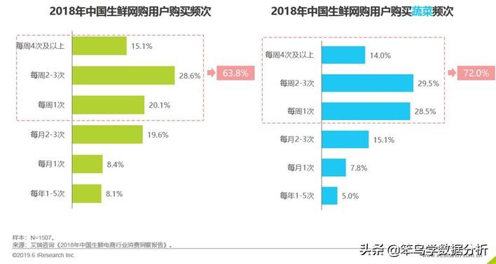 从购买生鲜品类来看,72.0%的用户网购蔬菜的频次在每周1次以上,远高于整体购买生鲜频次,见下图右边。