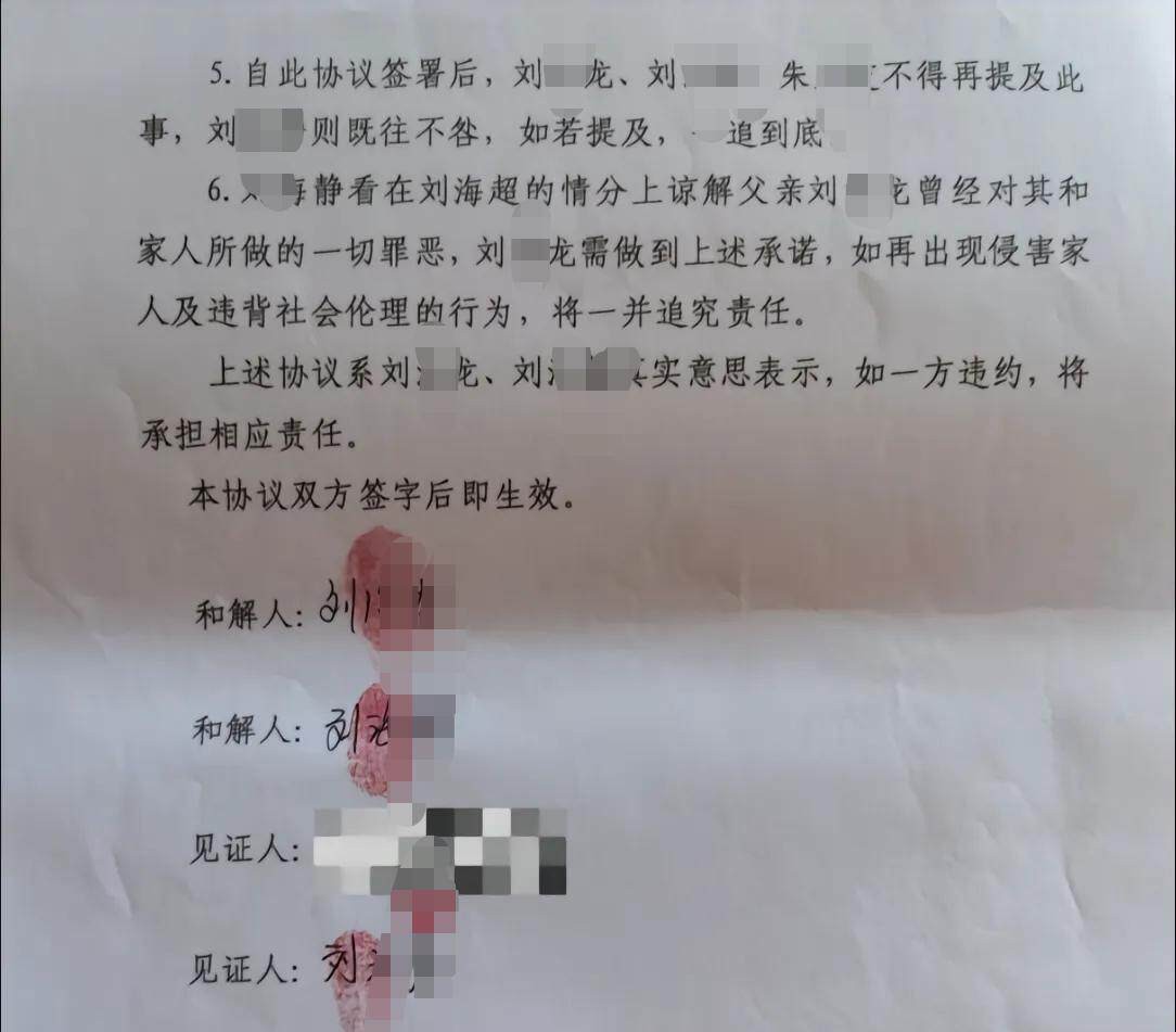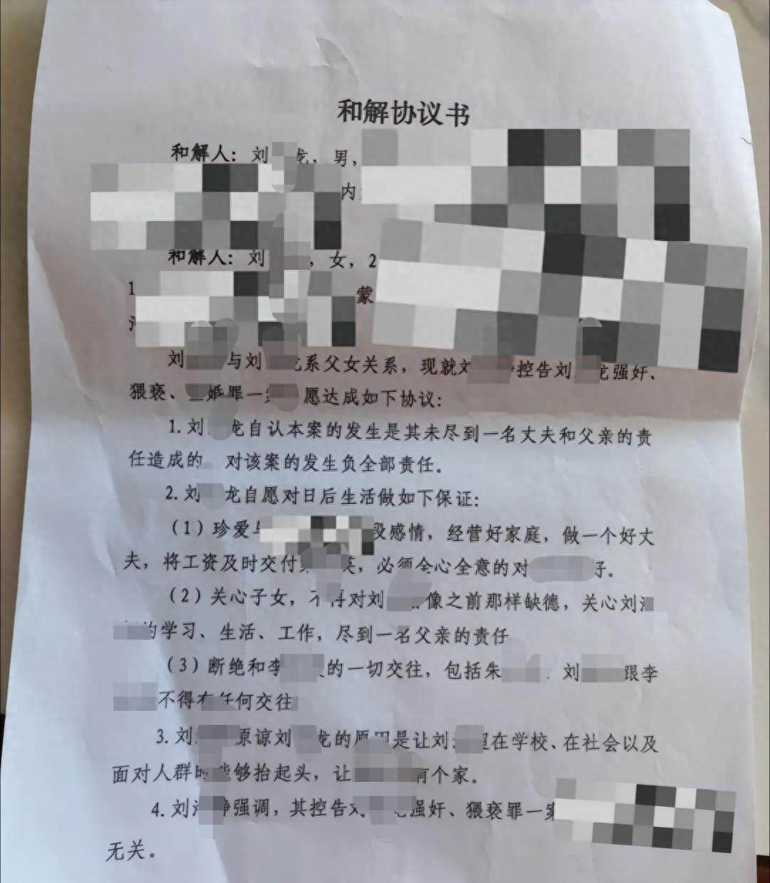 3月12日,受害者小刘在社交平台公布了一份和生父签订的和解协议书,双方就小刘控告生父强奸、猥亵、重婚罪一案达成协议:刘某龙不再提及此事,小刘既往不咎。小刘强调和解是为了弟弟和梁某某,与强奸猥亵一案无关。在刘某龙手写的保证书中,保证“再也不做对不起你的事”。