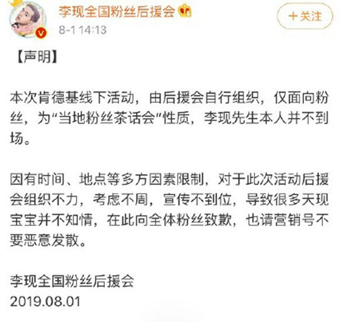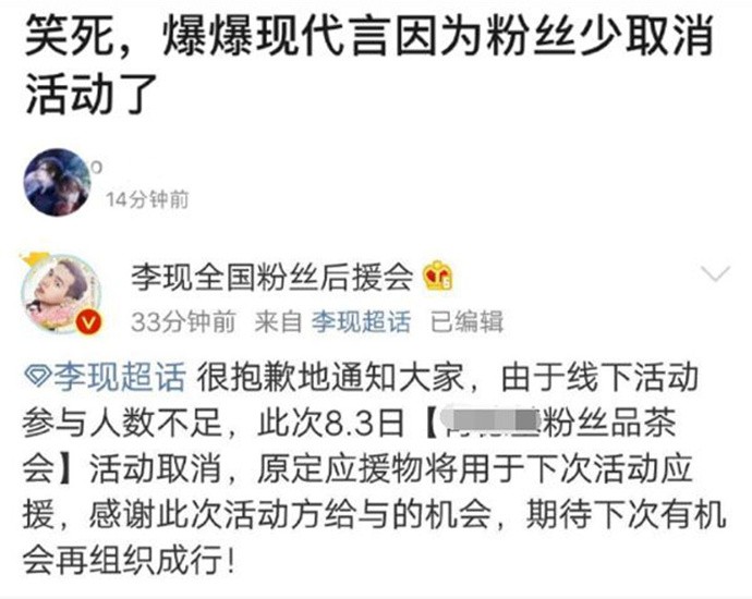 网友看到李现粉丝活动取消的消息,都开始嘲讽起来了:“七月男友,多一天都不行!”八月了嘛,七月男友就不要了?其实事情的真相是怎样的呢?李现的“全国粉丝后援会”发声明表示,这次线下活动是后援会自行组织的,仅面向粉丝,李现不会到场,而且还因为后援会组织不力考虑不周宣传不到位等原因造成的,很多粉丝根本就不知道。