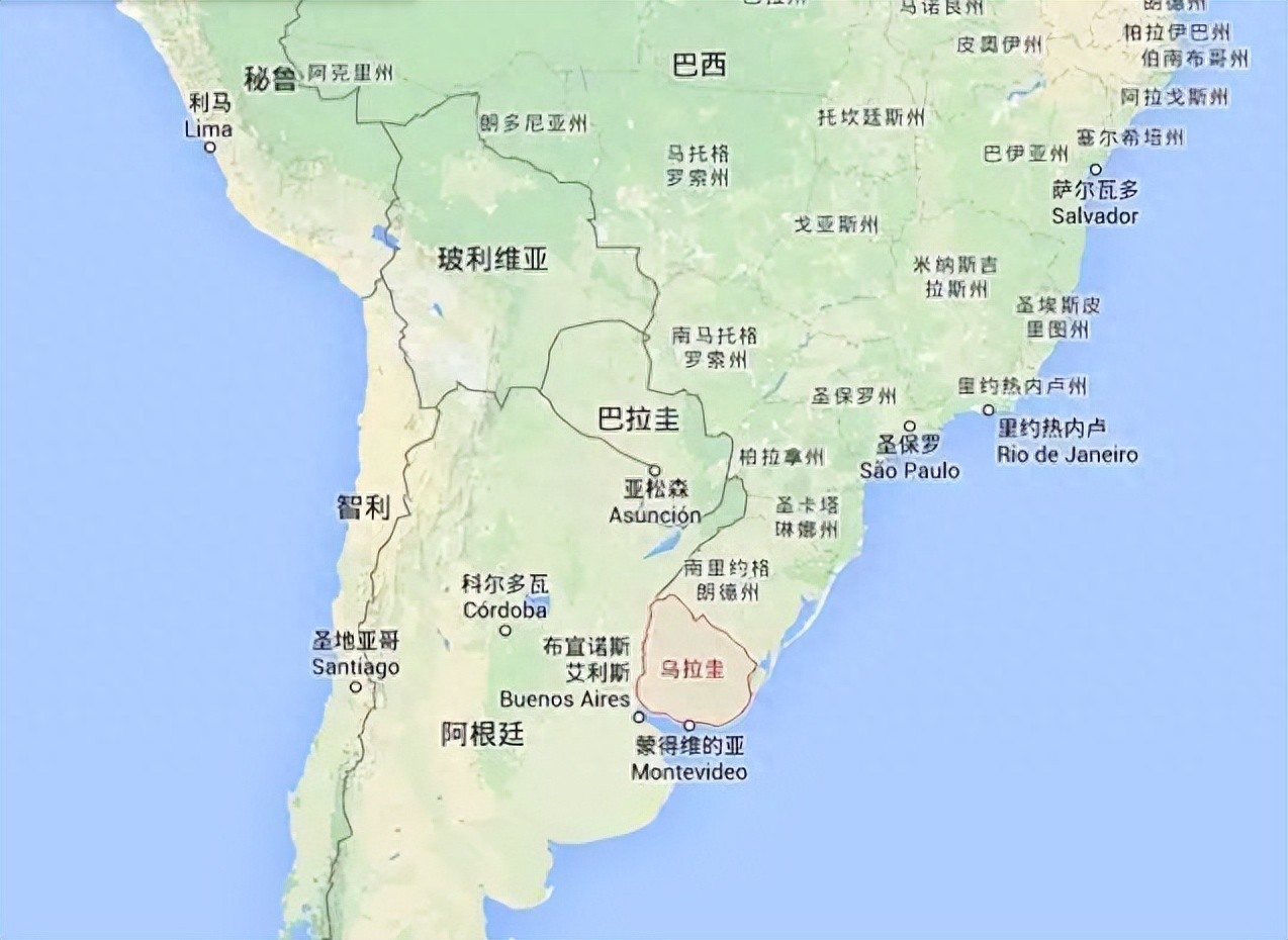 位于南美洲的东南部,乌拉圭河与拉普拉塔河的东岸,北邻巴西,西接阿根廷,东南濒大西洋。