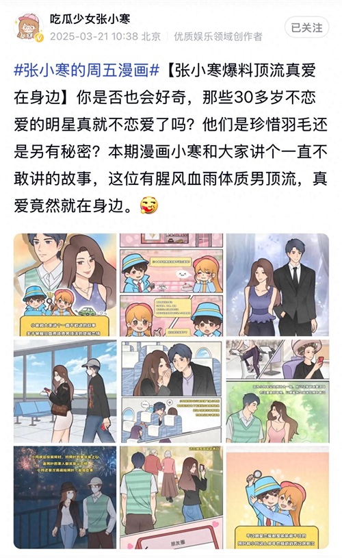 事情的起因是这个周五,知名娱记“张小寒”出来爆料,他以其独特的漫画形式,在社交媒体上发布了一则关于男顶流与女经纪人之间隐秘姐弟恋的消息。并且还透露,这位男顶流年龄在三十多岁,与年长的女经纪人恋爱已久。两人不仅拥有众多情侣同款服饰,还曾见过家长,身边的朋友和工作人员也都对这段关系默许不说。