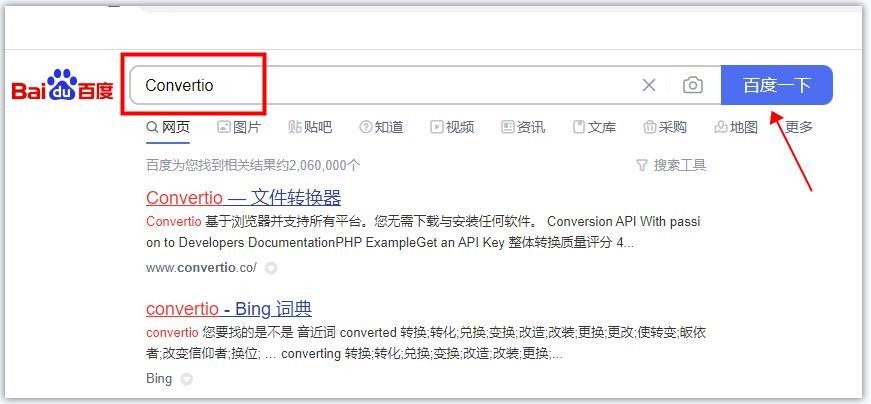 1、打开谷歌浏览器,使用百度搜索引擎搜索【Convertio】,找到并点击进入官网页面操作。