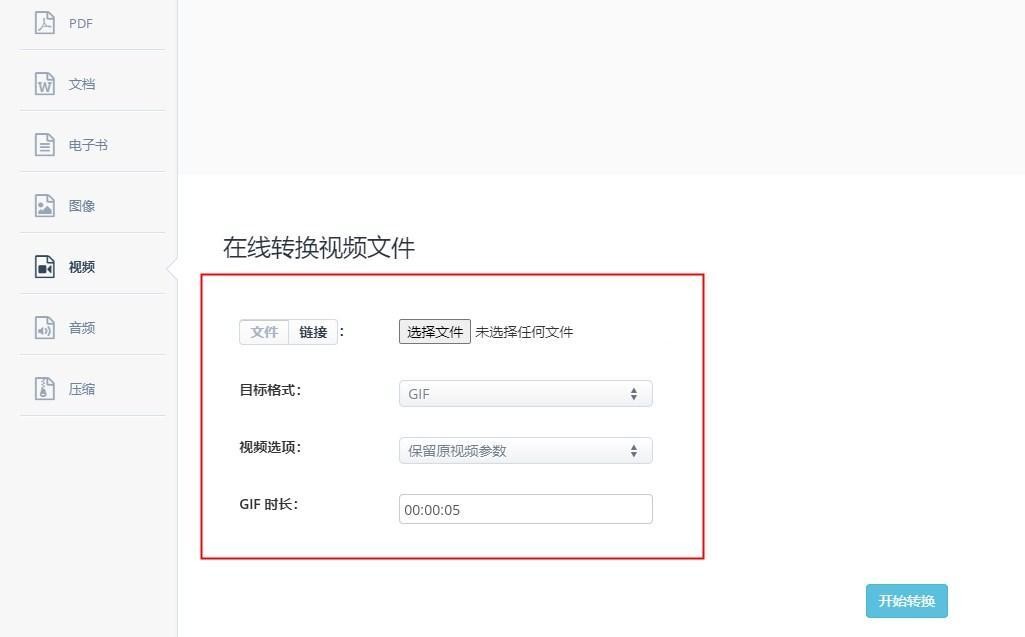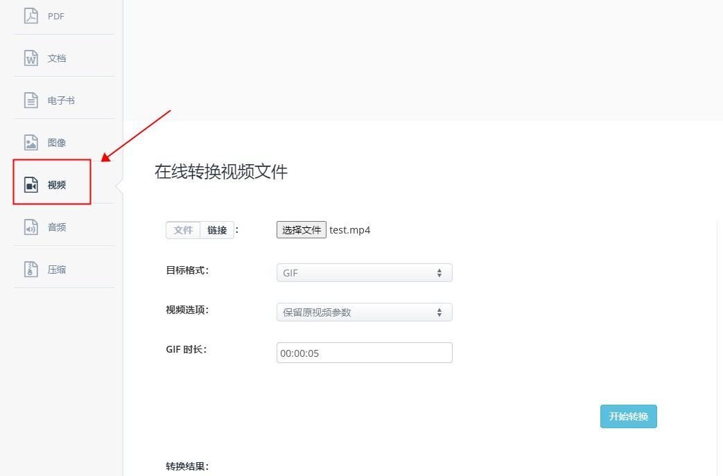 3、在右侧的界面中点击【选择文件】,上传准备好的视频片段到网页中;在【目标格式】的下拉框中选择【GIF】。