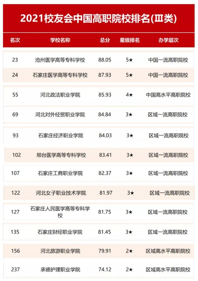 2021年校友会中国高职院校排名(Ⅲ类)中,沧州医学高等专科学科 (23)、石家庄医学高等专科学校(24)、河北政法职业学院(55)、河北对外经贸职业学院(69)、石家庄经济职业学院(93)进入全国100强。