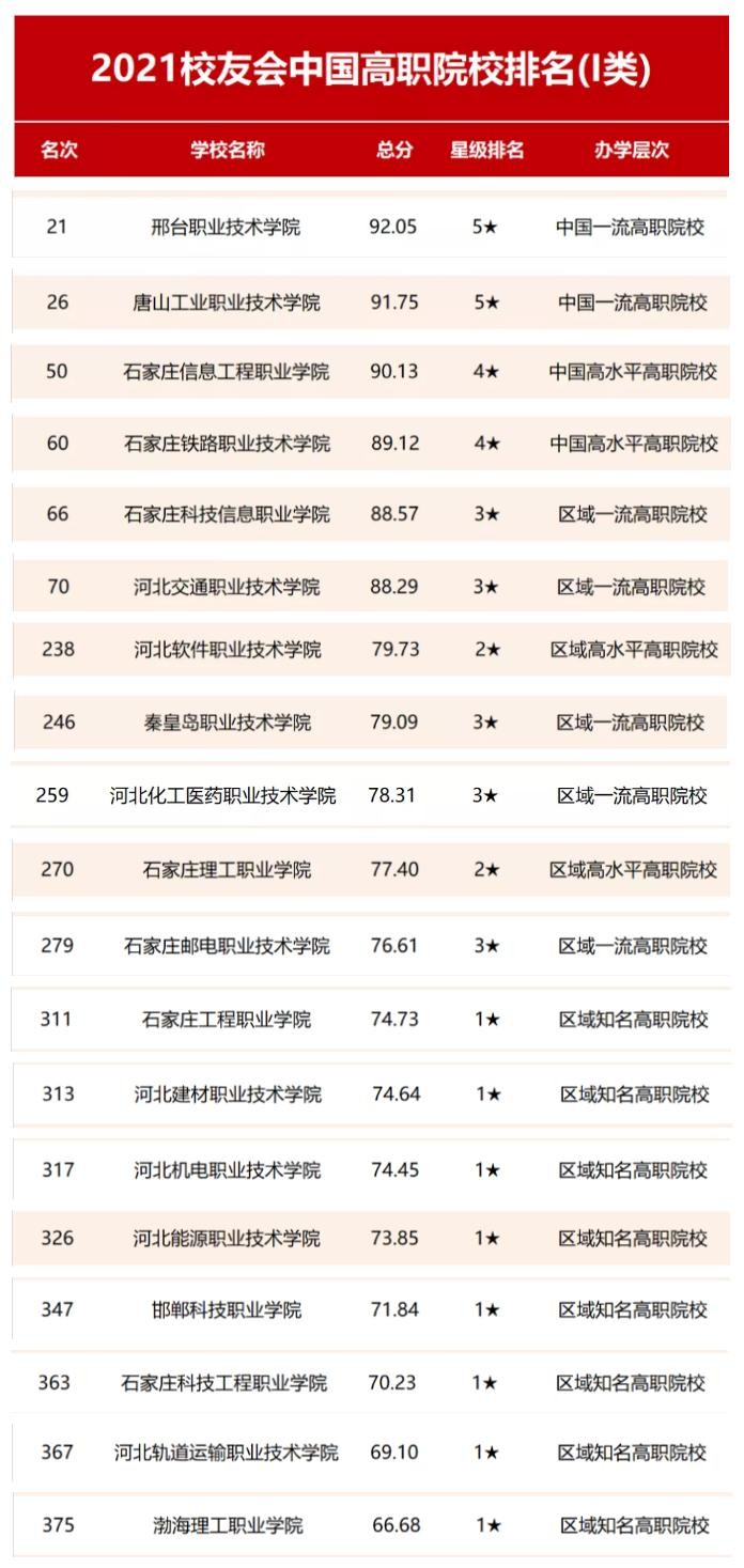2021年校友会中国高职院校排名(Ⅰ类)中,邢台职业技术学院排全国第21名,列河北省第1,唐山工业职业技术学院排第26位,列河北省第2,石家庄信息工程职业学院(50)、石家庄铁路职业技术学院(60)、石家庄科技信息职业学院(66)、河北交通职业技术学院(70)排名进入 全国100强。