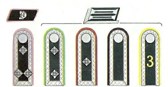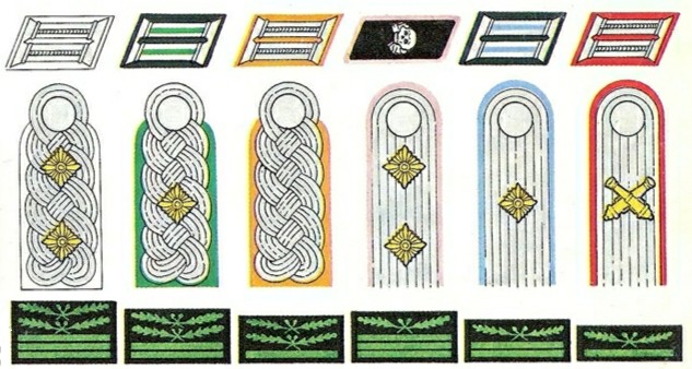 第二行的肩章从左到右依次为:上校(Oberst,步兵兵种色白色)、中校(Oberstleutnant,山地兵兵种色绿色)、少校(Major,骑兵兵种色金黄色)、上尉(Hauptmann,装甲兵兵种色粉色)、中尉(Oberleutnant,补给兵兵种色浅蓝色)、少尉(Leutnant,炮兵兵种色红色)
