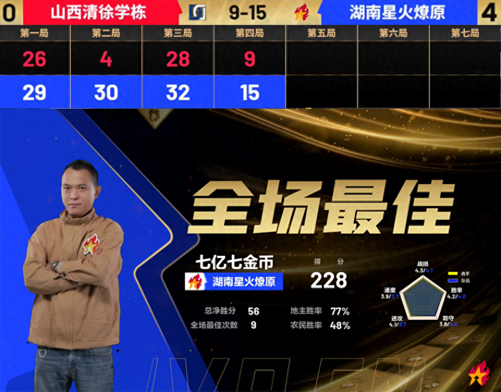在队长七亿七金币的带领下,湖南队最终以4:0痛击此前以六连胜晋级决赛的山西队,他本人还连续两天荣获了全场最佳。在湖南队的犀利攻势下,一贯善于抢开局的山西队也毫无招架之力,最终只能无奈吞下首败苦果。
