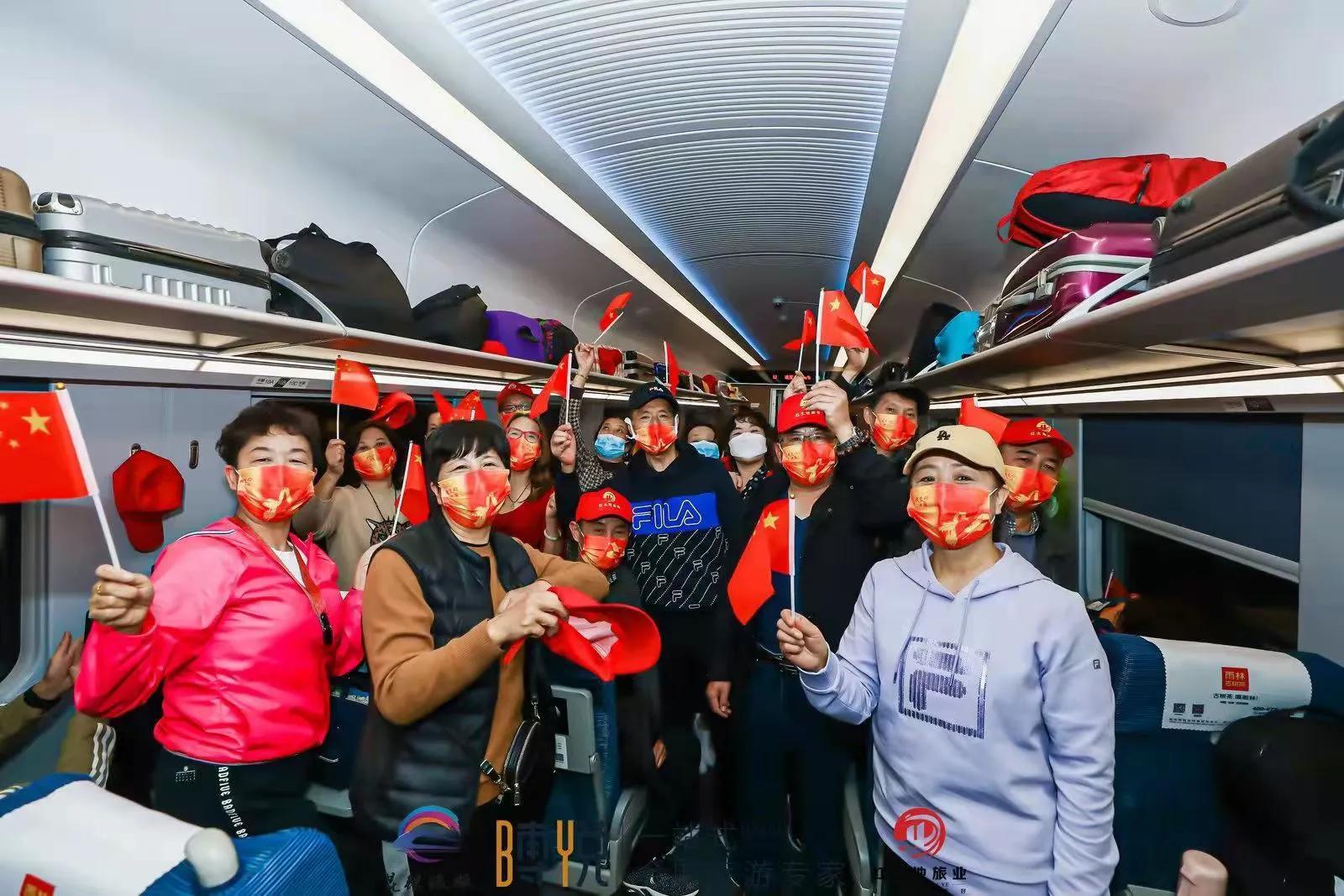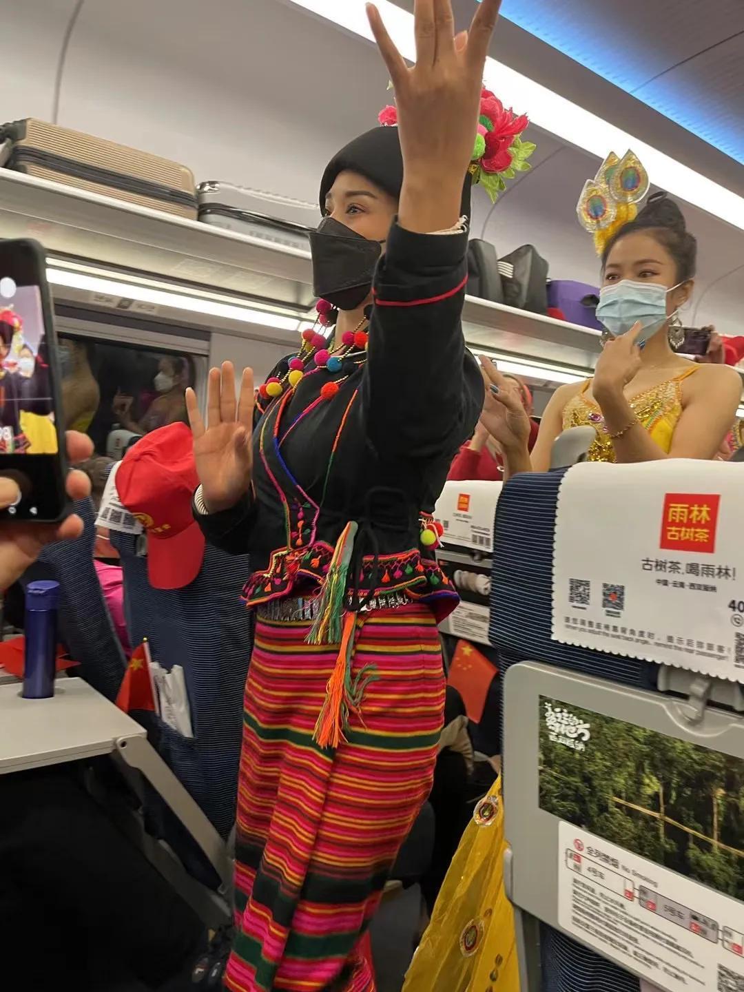 车厢里欢声笑语,灯火通明,到处是"我爱你中国"的口罩,随处见热情高涨的笑脸,一杆杆红艳艳的国旗在舞动,一遍遍"我和我的祖国"在回响,葫芦丝、象脚鼓、芒锣吹打着婀娜多姿的傣族少女翩翩起舞,闪光灯聚焦着一个个为中老铁路开通对党和国家的感言⋯