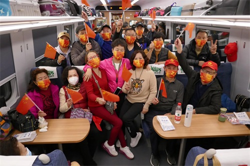 穿戴五颜六色的旅客,都把自己打扮的漂漂亮亮,为这节日般的出行不辱使命,为能抢票加入首发团倍感自豪。