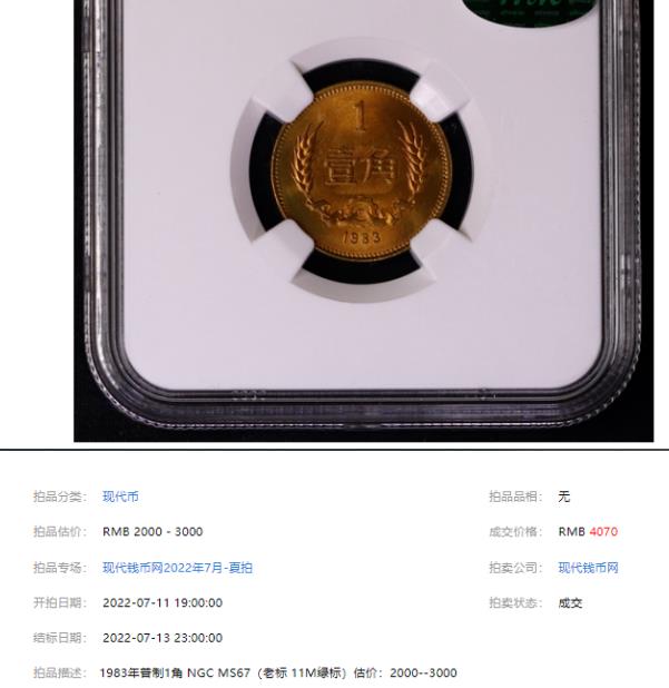 一枚1983年普制1角 NGC MS67(老标 11M绿标)拍出了4070元的高价。