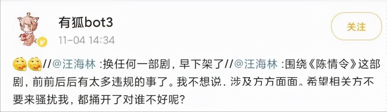还有之前编剧汪海林曾多次对陈情令发表看法,表示:《陈情令》有太多违规事,他不想说,涉及方方面面。这也再度引起了大众对《陈情令》这部作品的质疑。