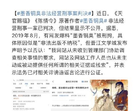 墨香铜臭的作品签给了晋江,而晋江一向是签人的,签约之后大部分著作权都由网站独家代理,但如果涉及到出版、影视改编等情况,据说晋江会和作者沟通,取得作者的同意。19年墨香被爆刑拘的消息时,晋江曾出声明否认,不知现在又作何解释?
