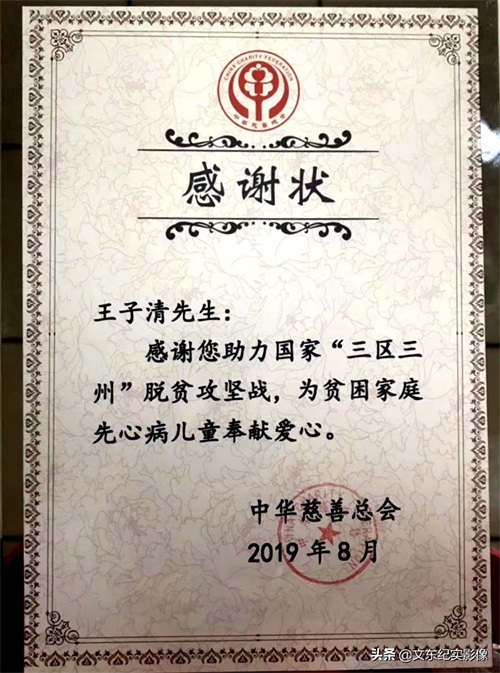 先是被央视提起,后又在10月份收到了中华慈善总会为其颁发的“感谢状”。感谢他助力国家“三区三州”脱贫攻坚战,为贫困家庭先天性心脏病儿童奉献爱心。