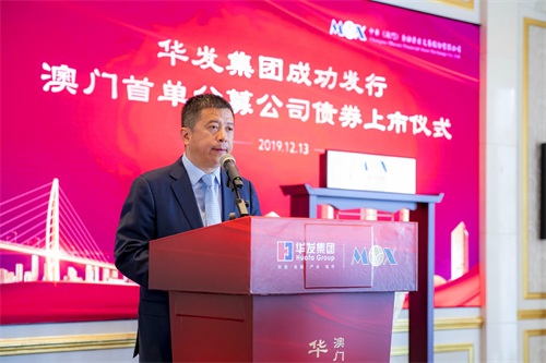 2019年12月13日,华发集团成功发行澳门首单公募公司债券。图为谢伟在发行仪式上致辞。